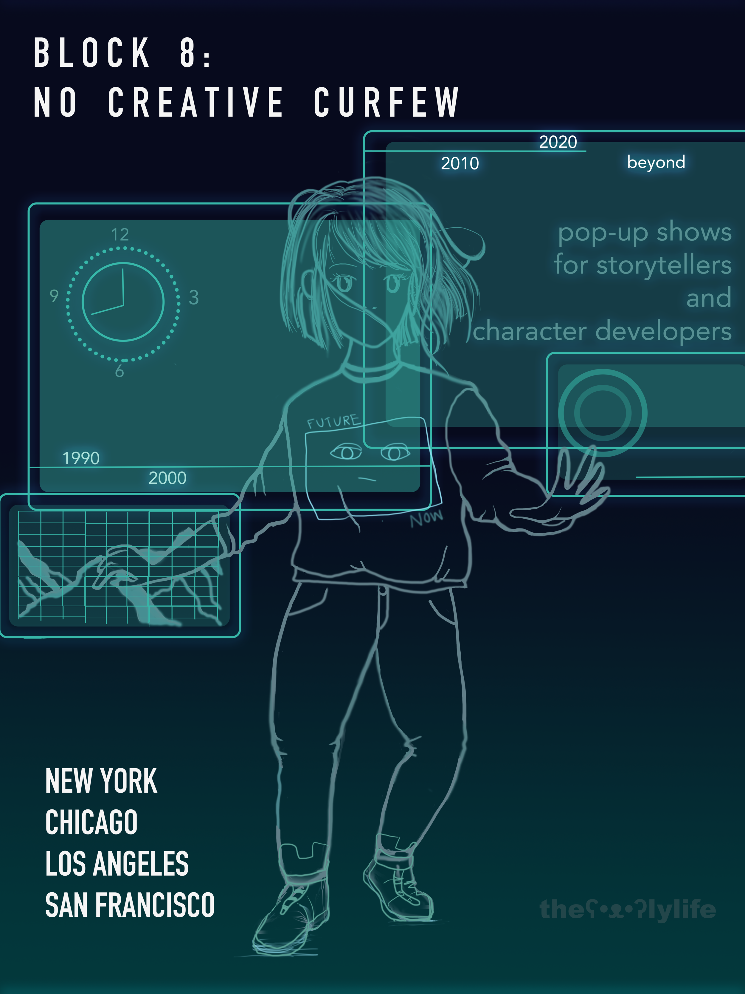 Block 8 is short for the 8PM programming block for adult-oriented animations that begin to air on television. However, being an adult is a 24hr responsibility. At Block 8, there is no curfew. The theme captures a glimpse of human nature, timelessness, nostalgia, hopefulness and freedom. Human beings are complex; some are fun, thoughtful, careless, responsible, reckless, and so forth.